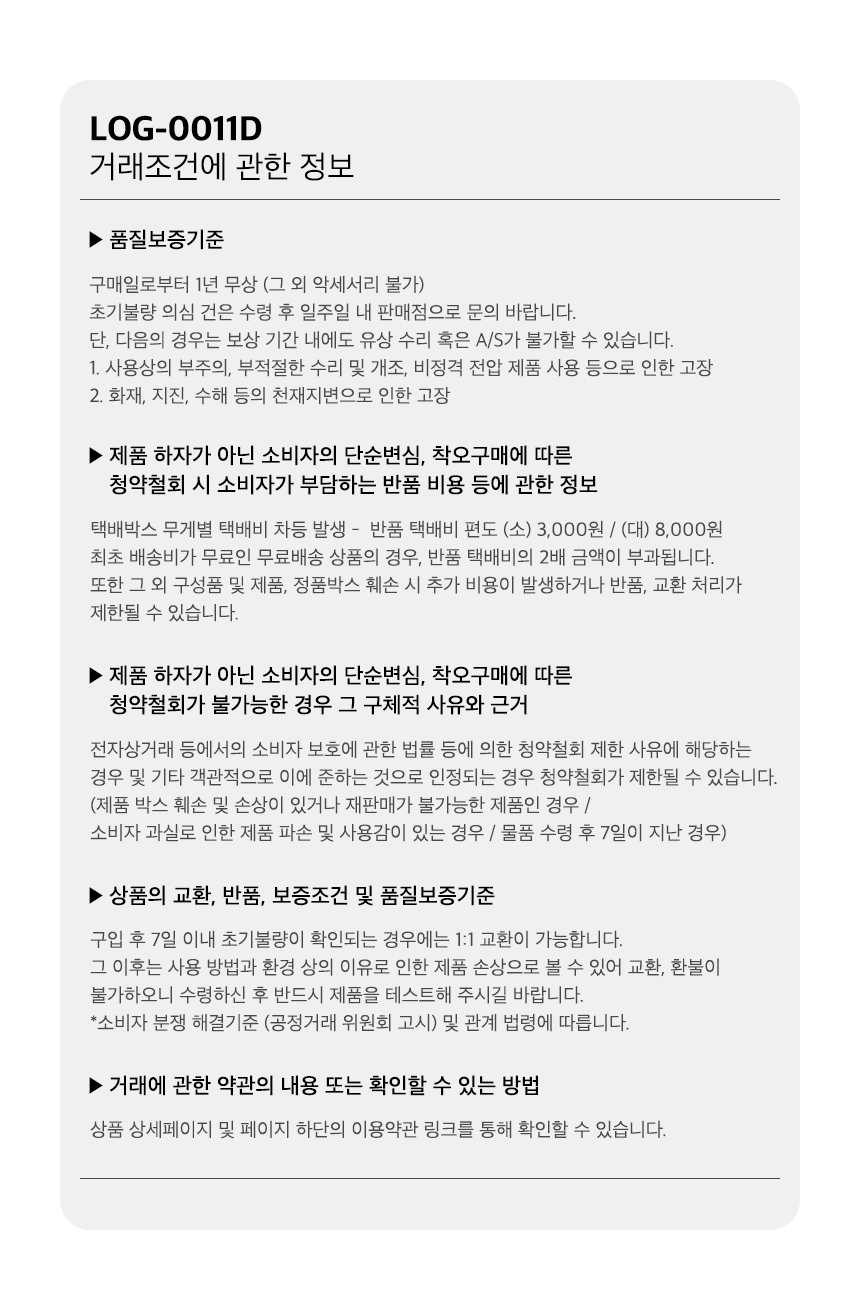 - 수입,명품 제품의 경우, 제품 및 본 상품의 박스 훼손, 분실 등으로 인한 상품 가치 훼손 시 교환 및 반품이 불가능 하오니, 양해 바랍니다.