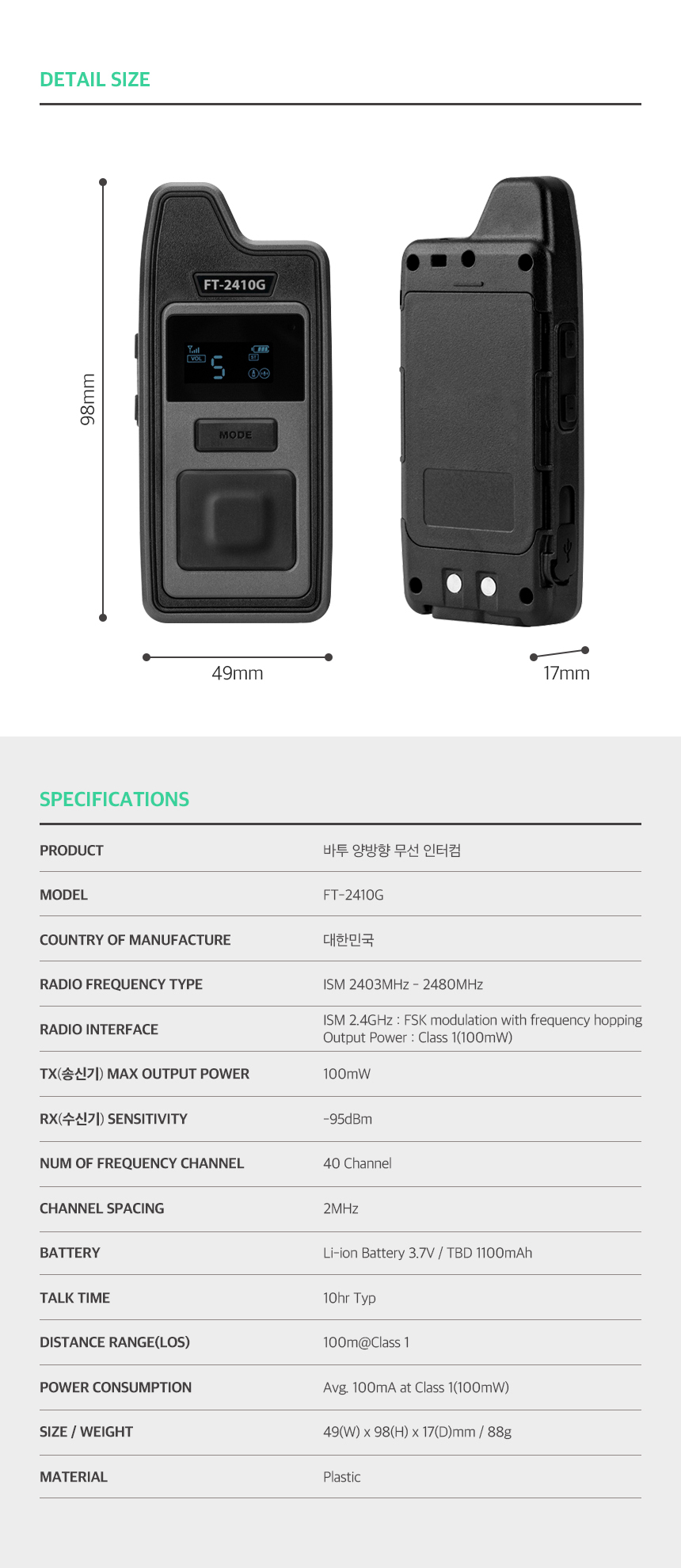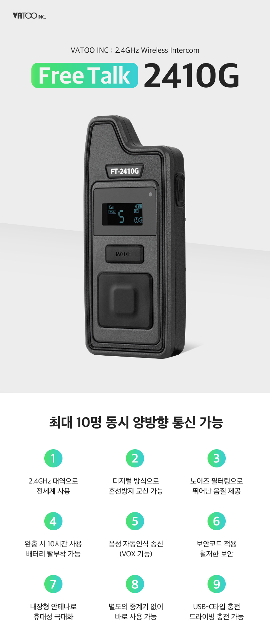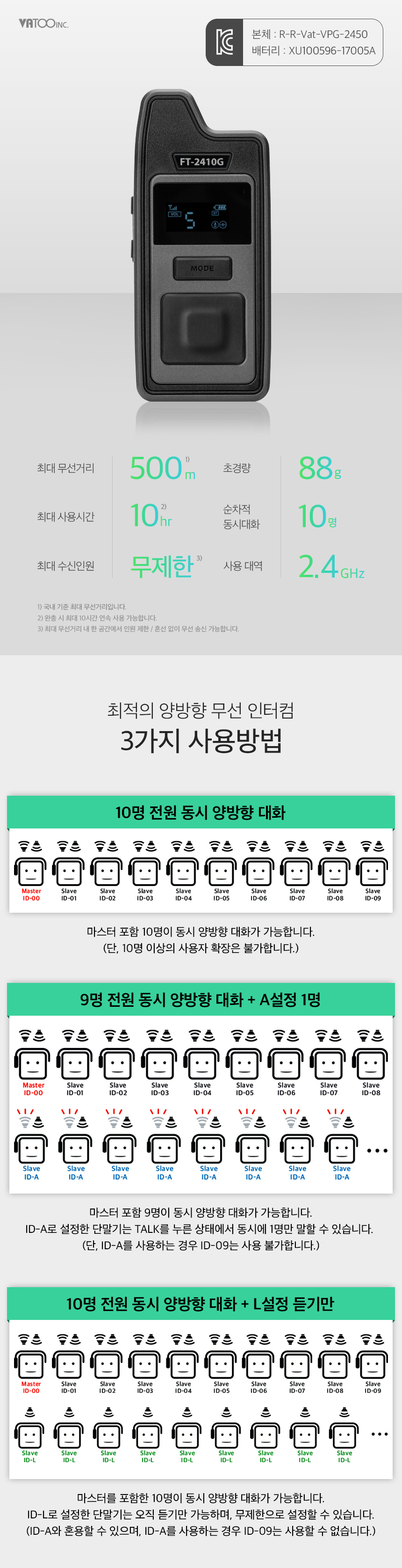 | 특징 | 최대 10명 양방향 통신 가능/40채널/최대 10시간 사용 | ||